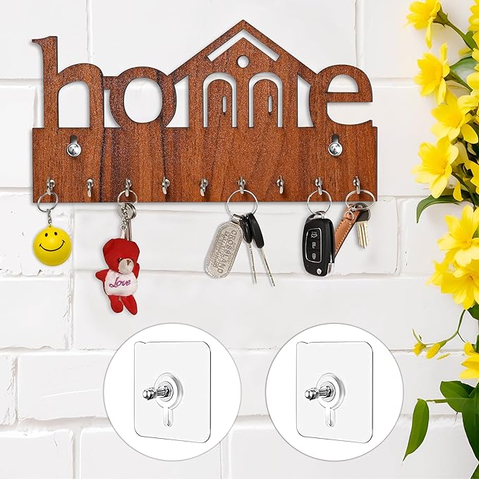 Keep your home tidy and your essentials within reach with this elegant No-Drill Key Holder. Designed with a warm wooden finish and a charming “home” cut-out, this key rack adds both functionality and style to any entryway, kitchen, or hallway.
